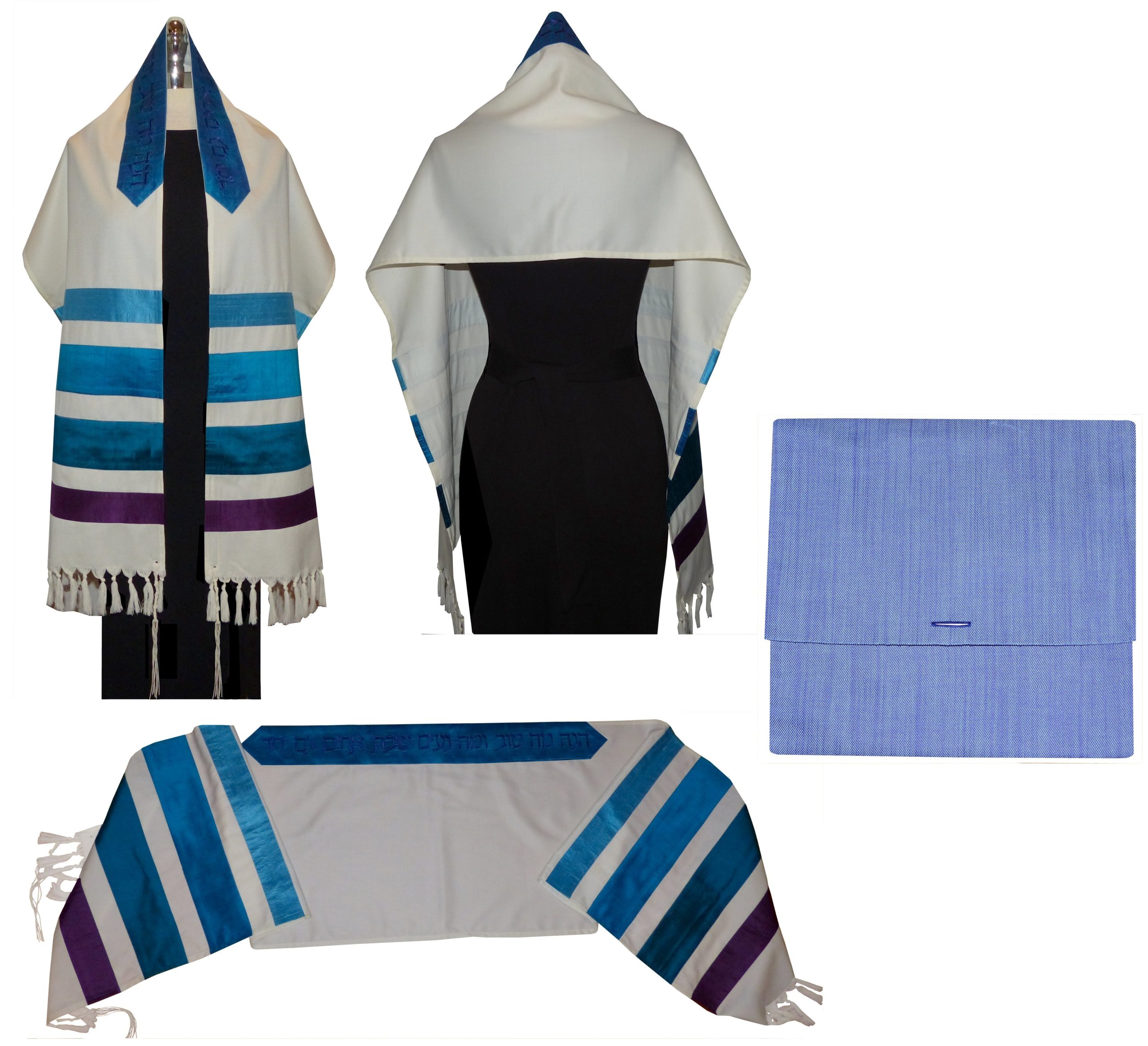 This is an Italian wool tallit with silk stripes in shades of blue and purple. Dimensions: 16″ wide x 72″long plus 3″hand-knotted fringe. Atarah in deep blue silk with purple lettering “Hinei Ma Tov.” A coordinating bag is included. $395.00 Please email if you are interested in purchasing this tallit.