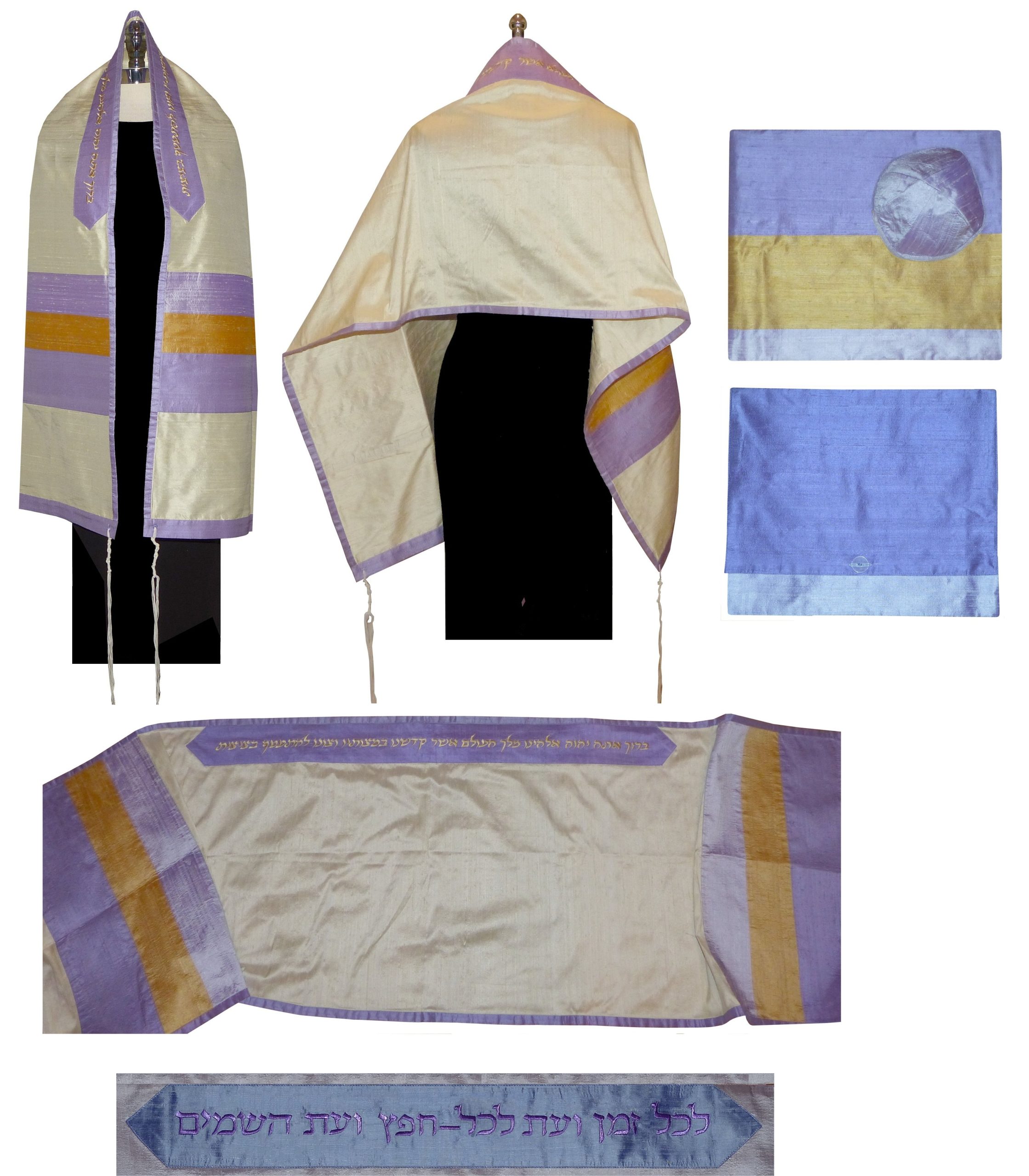 Single layer of off-white silk with stripes in lavender and gold. The tallit is trimmed on all sides with lavender silk. A matching tallit bag is included. $350.00 Please email if you are interested in purchasing this tallit.