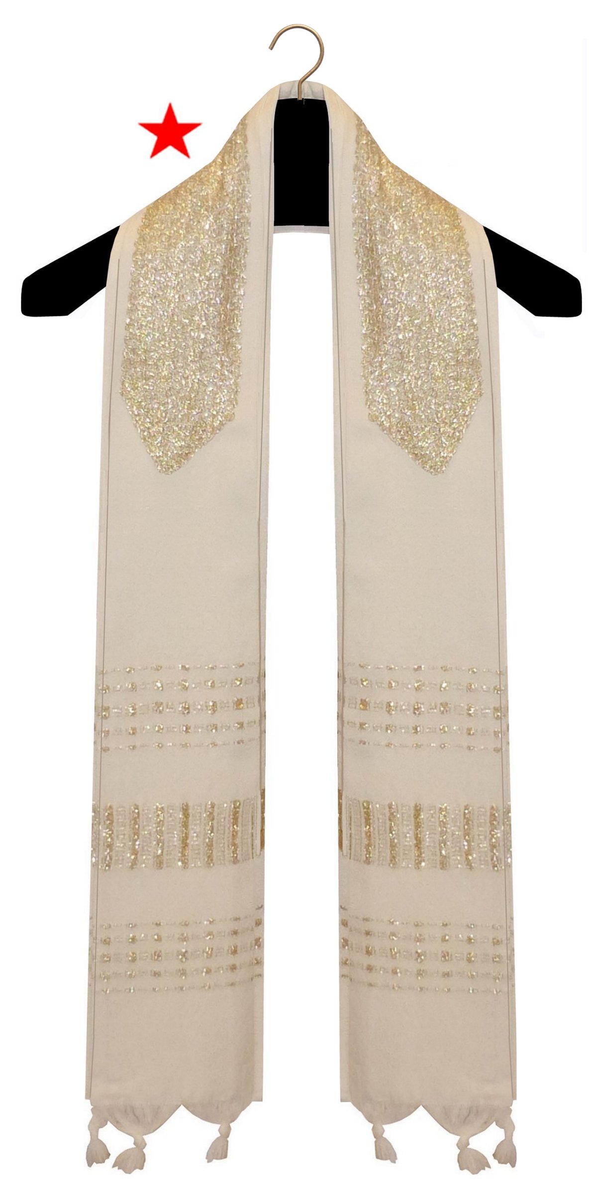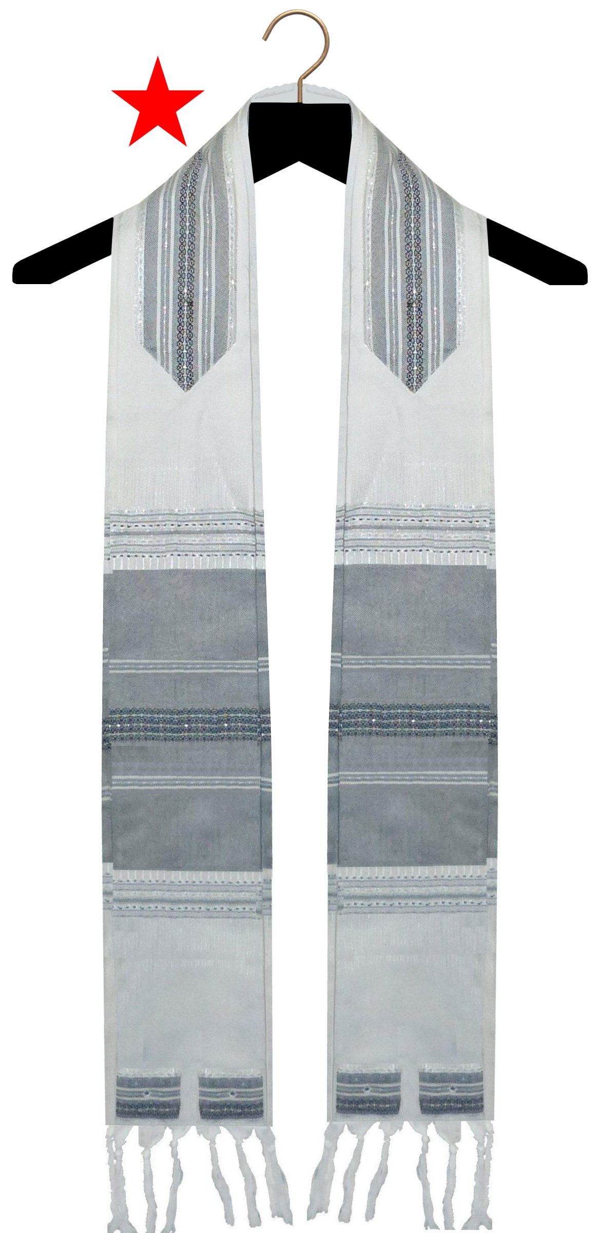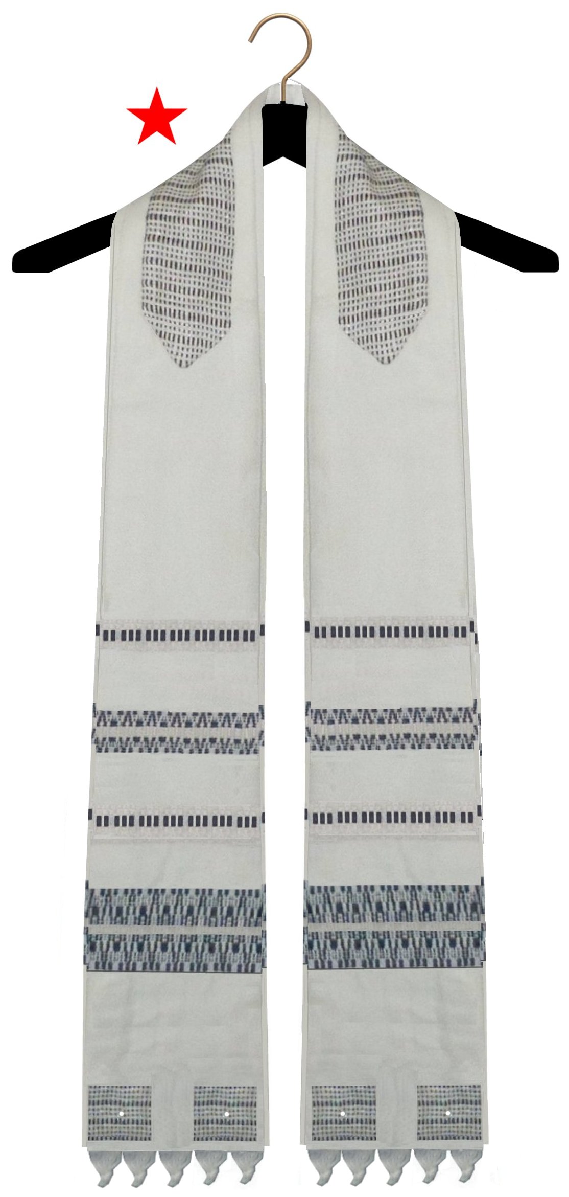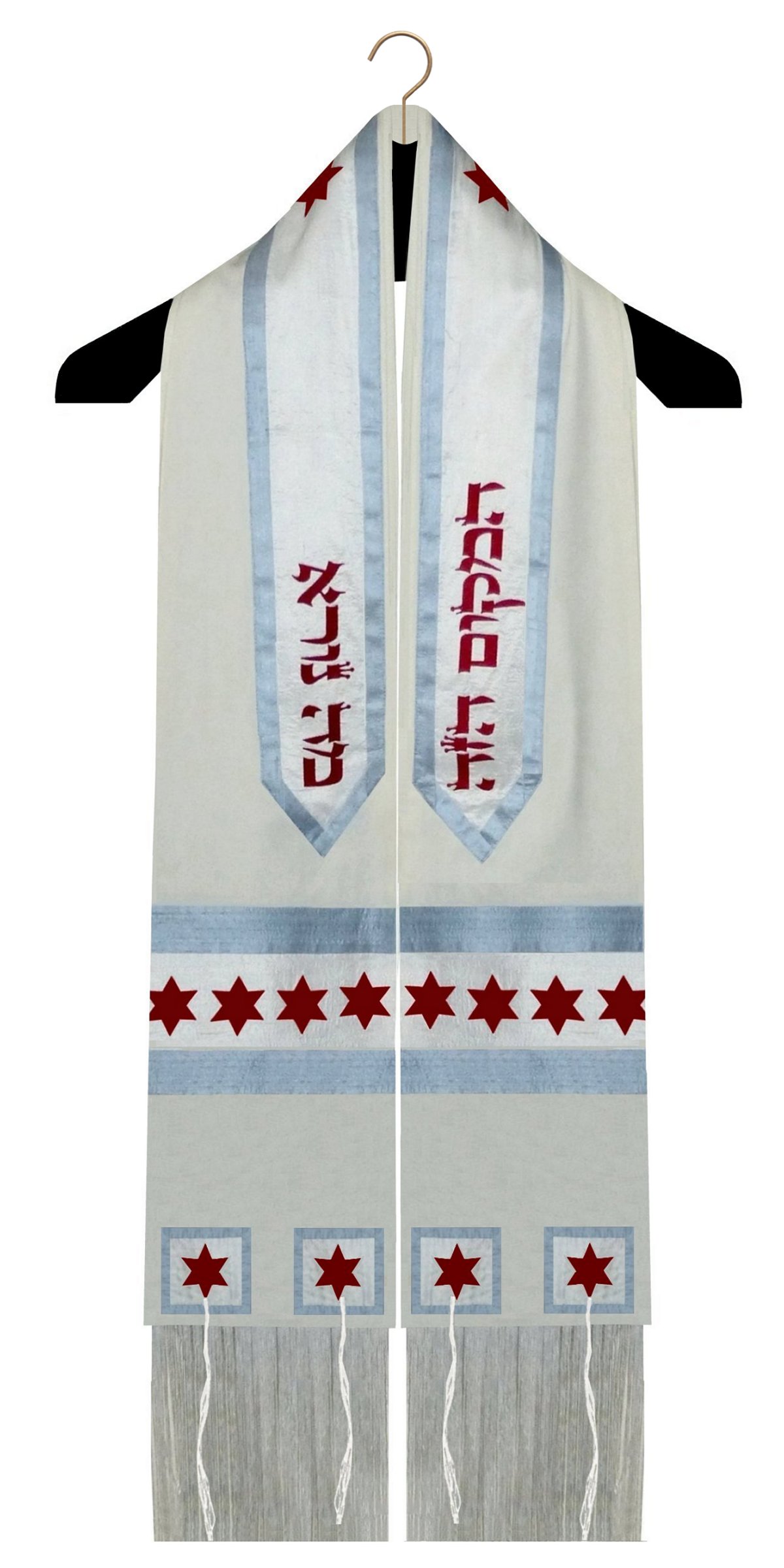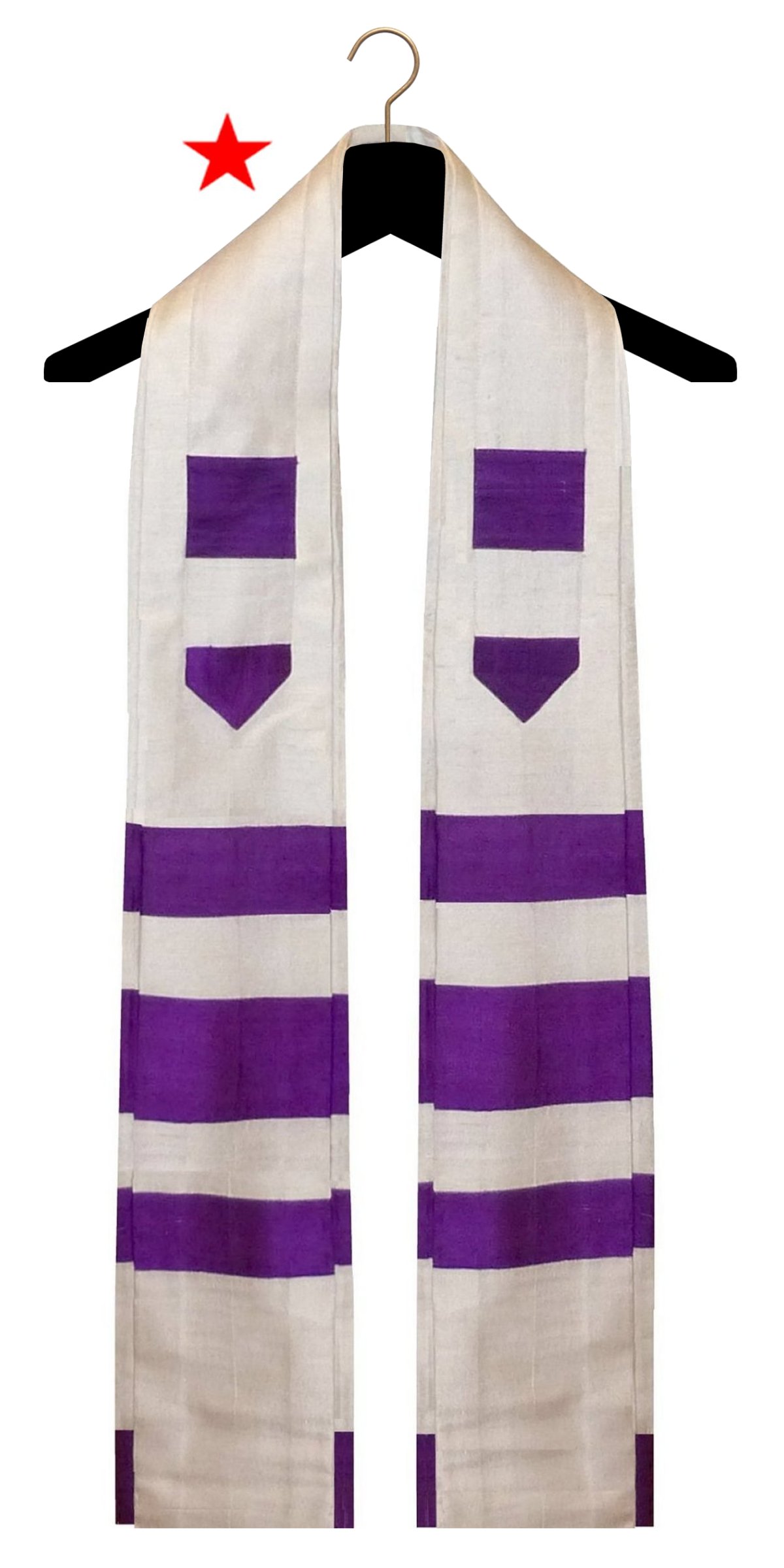 A clergy tallit is a narrow, form fitted garment, slightly wider at the bottom and narrowed at the neck. The sides are also folded under to form a pleat. The ones marked with a RED STAR belong to clients and were modified from a full sized garment to the clergy style. Many of them were woven on a loom or had trims sewn on that I cannot source, so I am unable to duplicate them (although they are good for inspiration!) All of the others were custom made and are not available for sale, but I can make one similar.